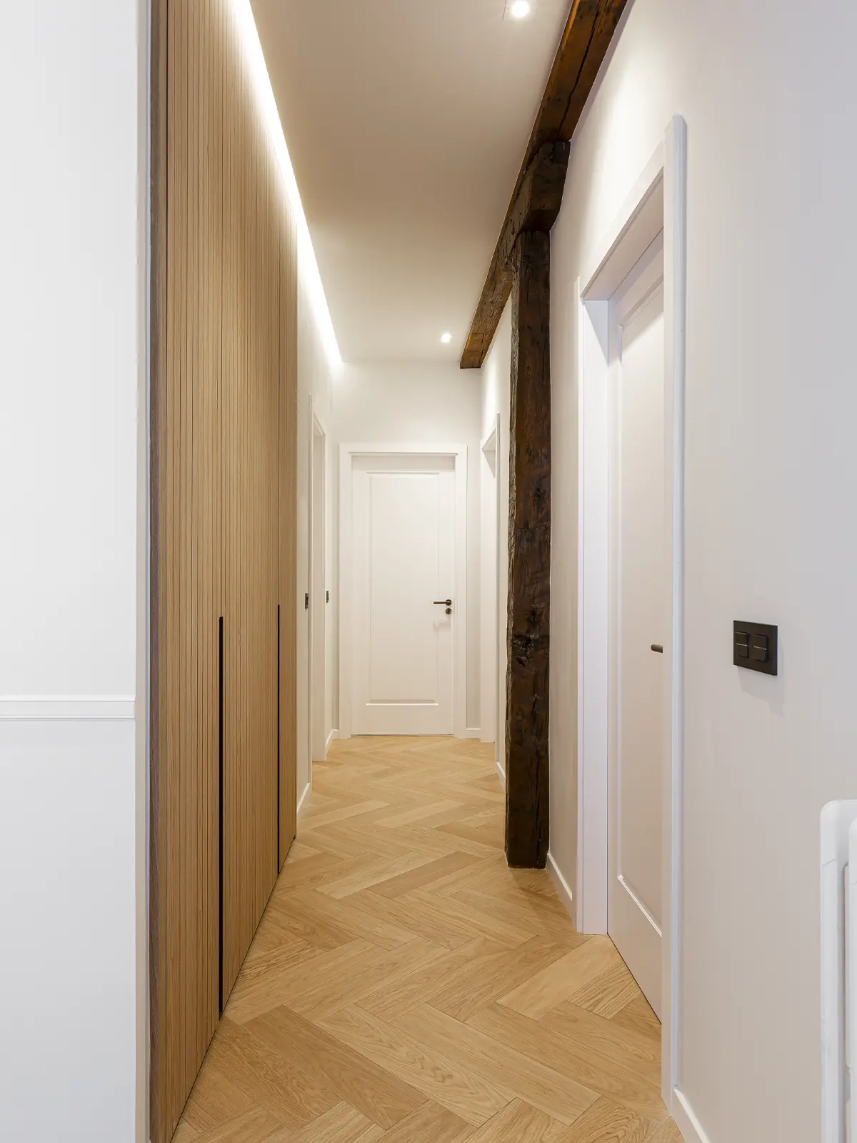 Se ha jugado con la combinación de suelos de madera natural en espiga, molduras decorativas en pared, y cerámicos hidráulicos en suelo de cocina,  así como porcelánicos de formato grande en baño.