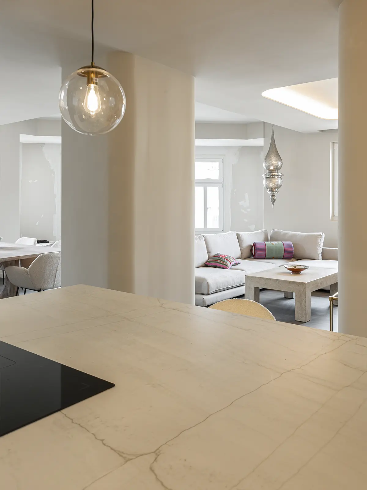 La vivienda de estructura de hormigón con fachada principal en esquina a gran vía y máximo aguirre y 3 patios interiores, se compone 2 dormitorios + dormitorio en suite con vestidor, 3 baños completos, cocina abierta junto a salón – comedor muy amplio y lavadero adaptado a una persona joven.